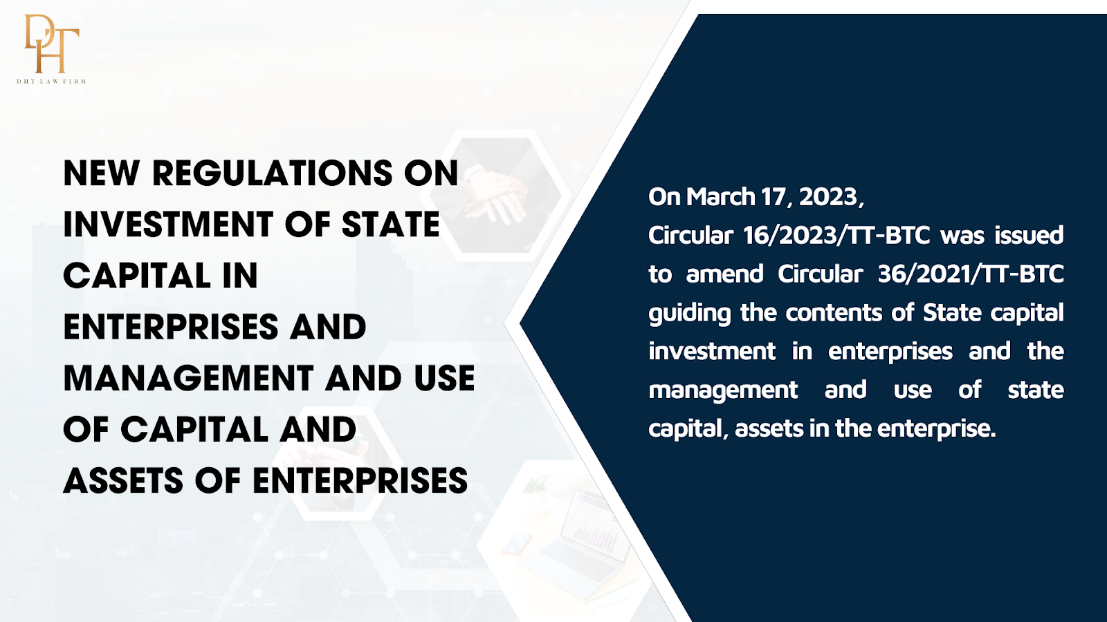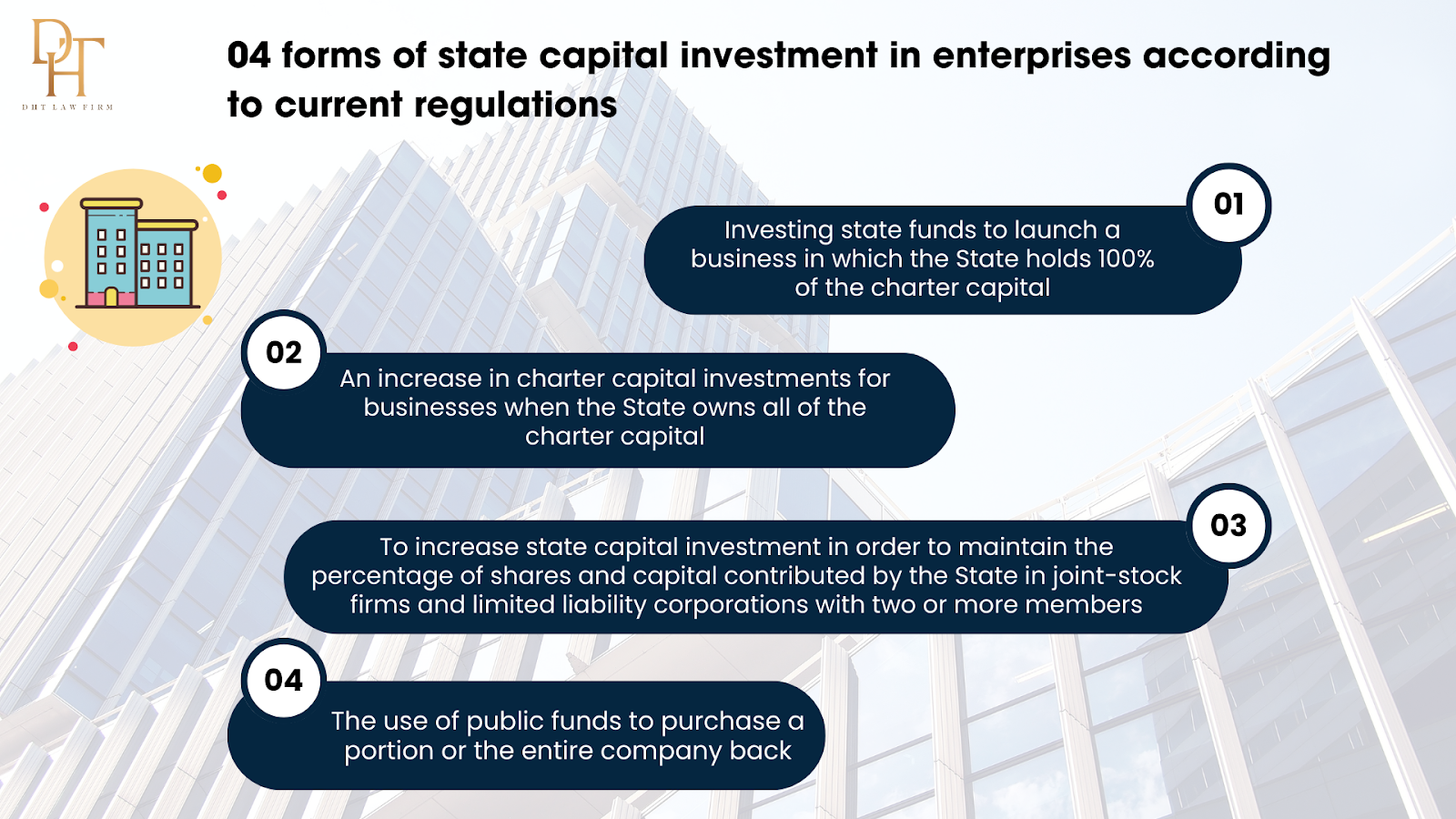 The article above by Dai Ha Thanh Law Firm provides information on general regulations on state capital investment in firms, as well as management and use of state capital in enterprise assets. If you have any questions or concerns, please contact us for competent legal counsel.