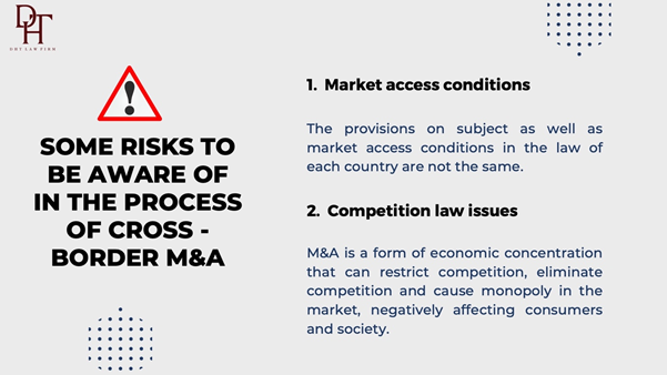 ● Therefore, the law governing cross-border M&A relations is not only encapsulated in a national legal system, but may be governed or influenced by the legal systems of other countries and related international laws. In a cross-border M&A deal, enterprises do not only consider conditions such as the subject, limit on share ownership rate, capital contribution, market share ownership rate, etc like domestic M&A, but also should note about market access according to commitments between countries, on ensuring the investment environment, protecting national security values, the community.
