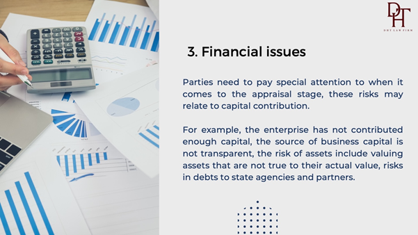 This is a risk that parties need to pay special attention to when it comes to the appraisal stage, these risks may relate to capital contribution. For example, the enterprise has not contributed enough capital, the source of business capital is not transparent, the risk of assets includes valuing assets that are not true to their actual value, risks in debts to state agencies and partners. Normally, in order to check and review financial related contents, the buyer will hire independent audit units to review financial risks. And for assets, the buyer will hire an appraiser to determine the enterprise value.