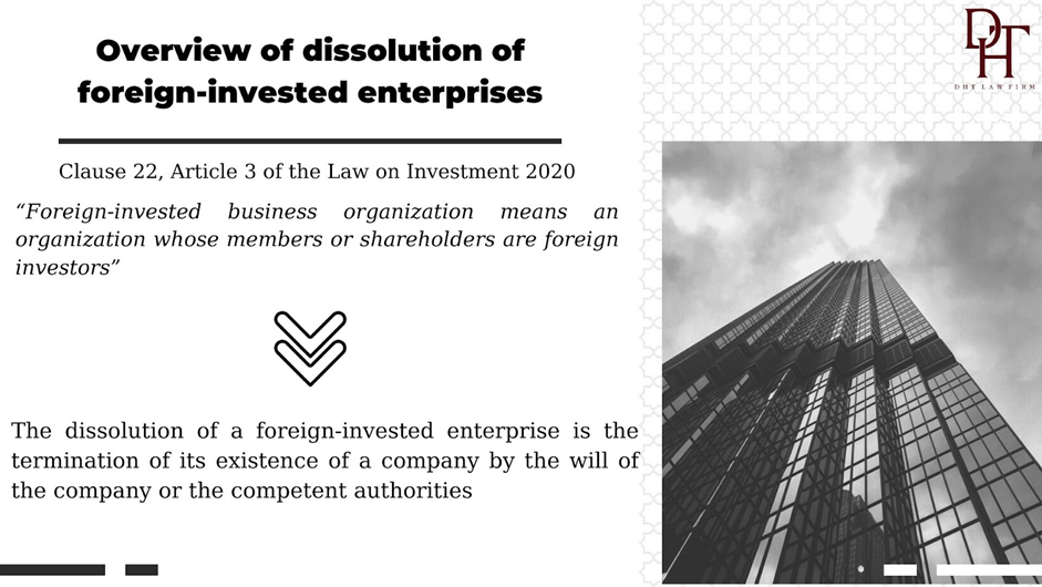 Vietnam is becoming one of the countries where globalization is the most vibrant. Such a growing globalized economy is attracting a large number of foreign investors, which plays an important role in the growth of international economic integration, capital, advanced technology, organizational capacity, management, and participation in the global supply chain. According to the General Statistics Office, in 2021, despite the complicated developments of the Covid-19 epidemic, FDI inflows into Vietnam reached 31.15 billion USD, rising by 9.2% compared to the same period in 2020. This shows that foreign investors have great confidence in Vietnam's investment environment. It is undeniable that the majority of foreign-invested enterprises in Vietnam have achieved great results and profits from the Government’s policies and the stable economic and social conditions in Vietnam. However, in that context, there are still several reasons leading to the dissolution of foreign-invested enterprises.