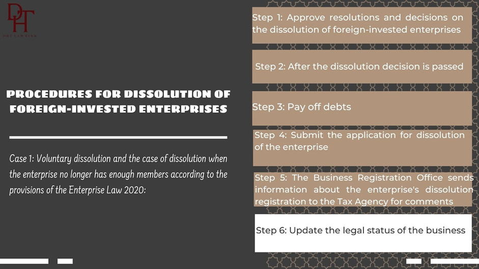 Pursuant to Clause 1, Article 207 of the Law on Enterprise 2020 and Clause 6, Article 41 of Decree No. 01/2021/ND-CP on business registration, the dissolution of a foreign-invested enterprise is the termination of its existence of a company by the will of the company or by the competent authorities. In other words, the dissolution of an enterprise is understood as the termination of its legal status and related rights and obligations. When the enterprise dissolution procedure is completed, this status will be updated on the National Business Registration Portal.