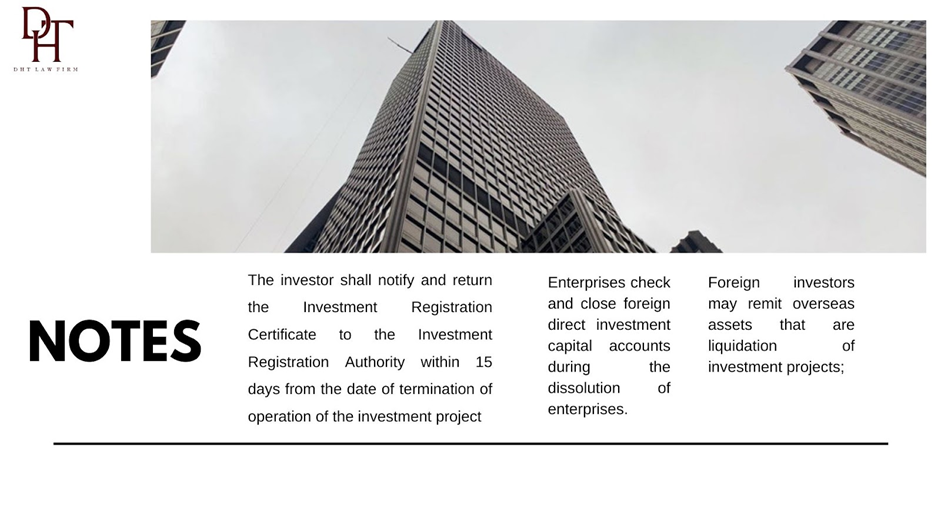 - Regarding the termination of an investment project, a foreign-invested enterprise that is granted an Investment Registration Certificate or equivalent document in addition to carrying out the procedures for dissolution of the enterprise, the investor shall notify and return the Investment Registration Certificate to the Investment Registration Authority within 15 days from the date of termination of operation of the investment project, enclosed with a copy of the document recording the termination of operation of the investment project. The investment registration agency shall notify the termination of operation of the investment project to the relevant agencies.
