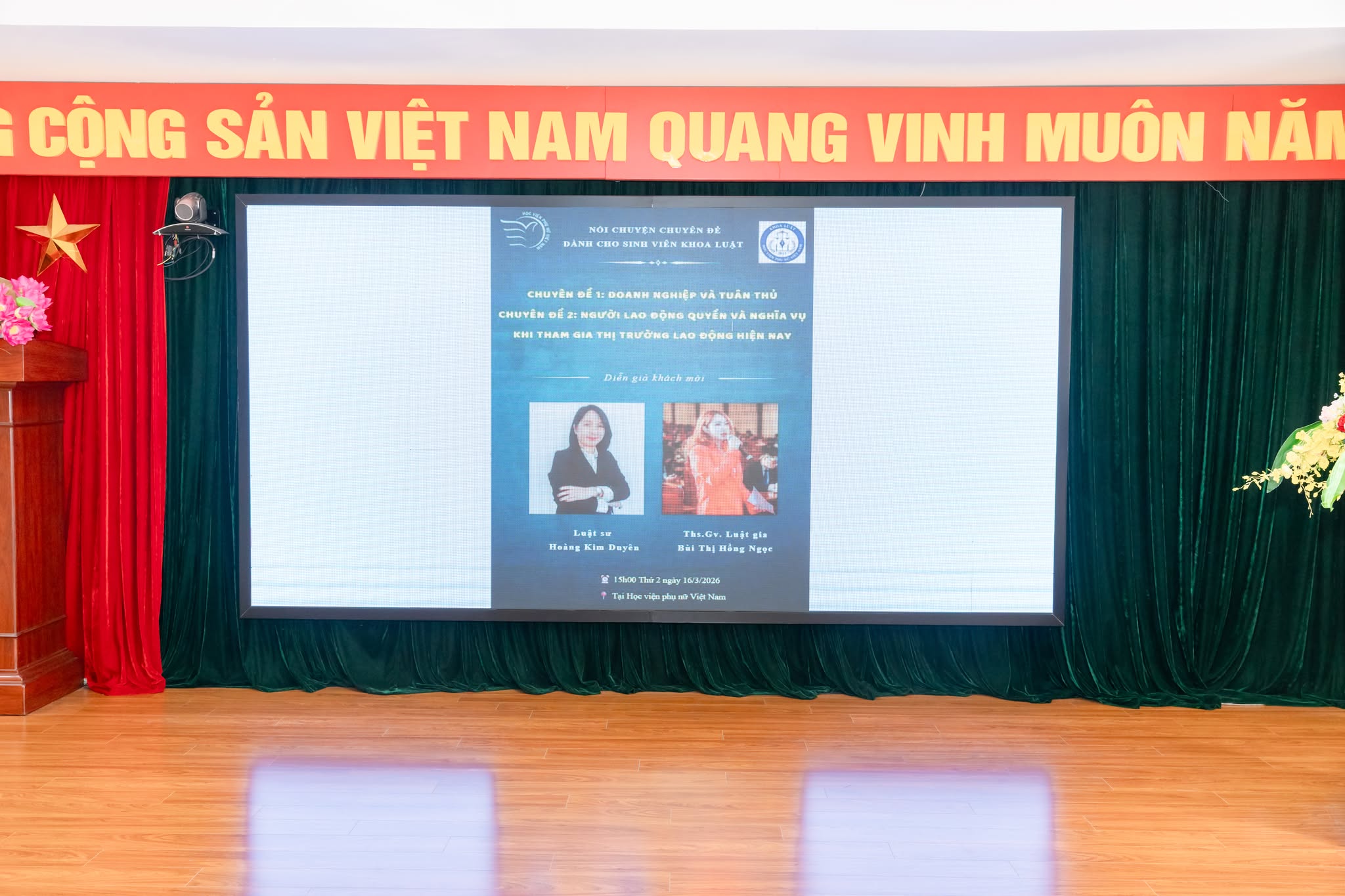 On March 16, 2026, at the Vietnam Women’s Academy, the program titled “Specialized Talk for Law Students” was successfully held, attracting significant attention and participation from a large number of students. The program was organized with the aim of bridging academic knowledge with practical legal experience, providing a more comprehensive perspective on the legal environment beyond the classroom. It also offered students the opportunity to directly engage with experienced legal professionals and lawyers, thereby helping them better shape their future career orientation.